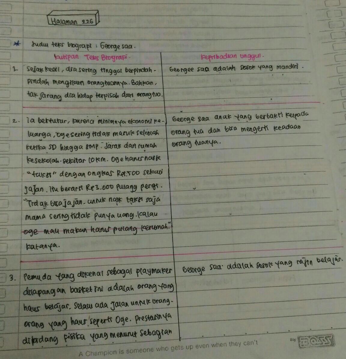 Penggalan biografi di bawah ini. Bacalah kembali biografi george saa dan ardian syaf di. 3.15.3 mengidentifikasi kaidah bahasa teks biografi. Teks biografi george saa dan ardian syaf, kemudian analisislah bagaimana karakter unggul tokoh di sampaikan . Analisislah kaidah kebahasaan (penggunaan kata ganti, kata kerja tindakan, kata kerja pasif, kata kerja mental, dan kata sambung) dalam teks .
